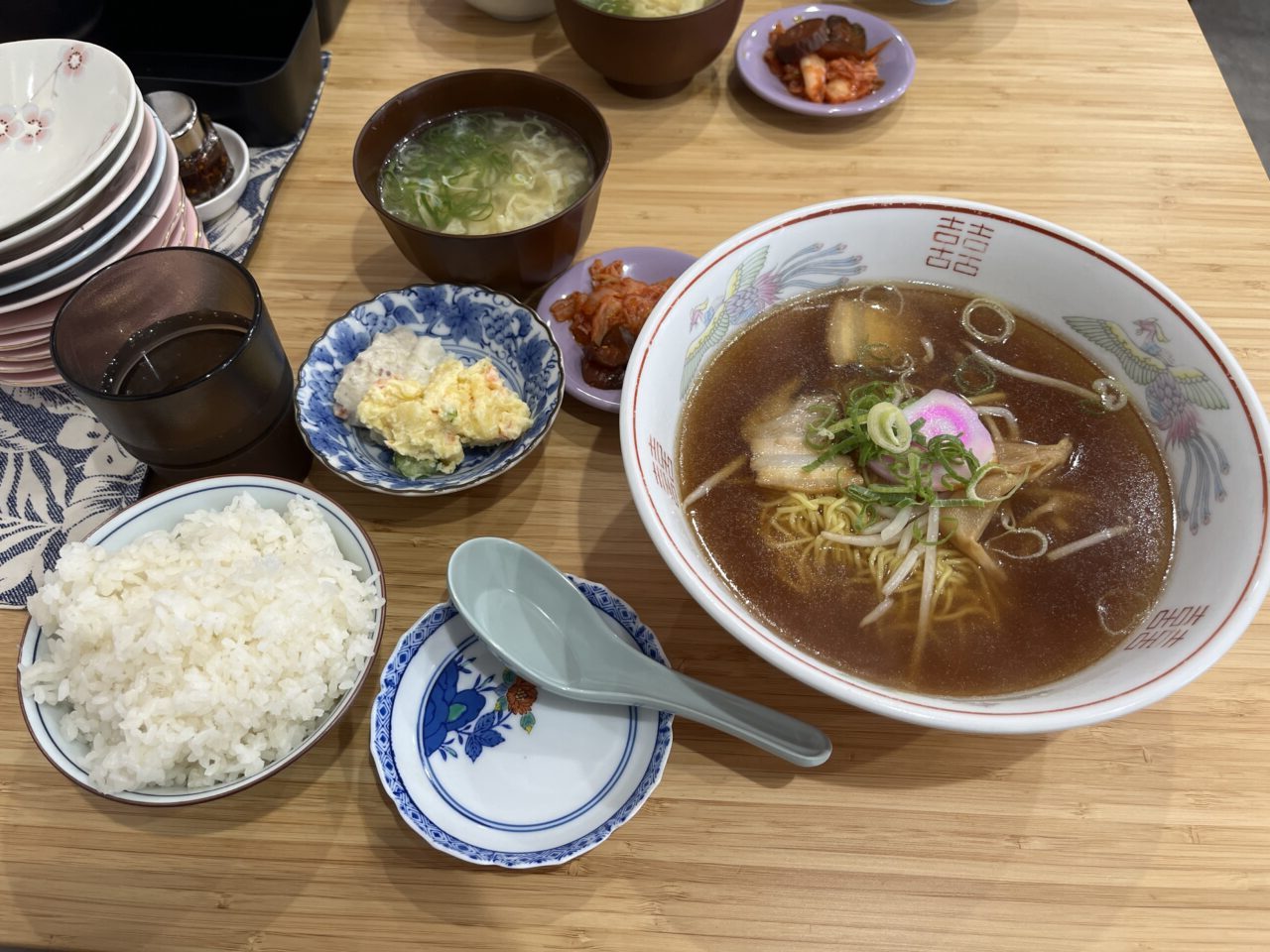 こちらはラーメン定食です。もやし、ネギ、ナルト、チャーシューという王道の具材のシンプルなラーメンで、「これこれ!」と言いたくなるどこか懐かしい味。