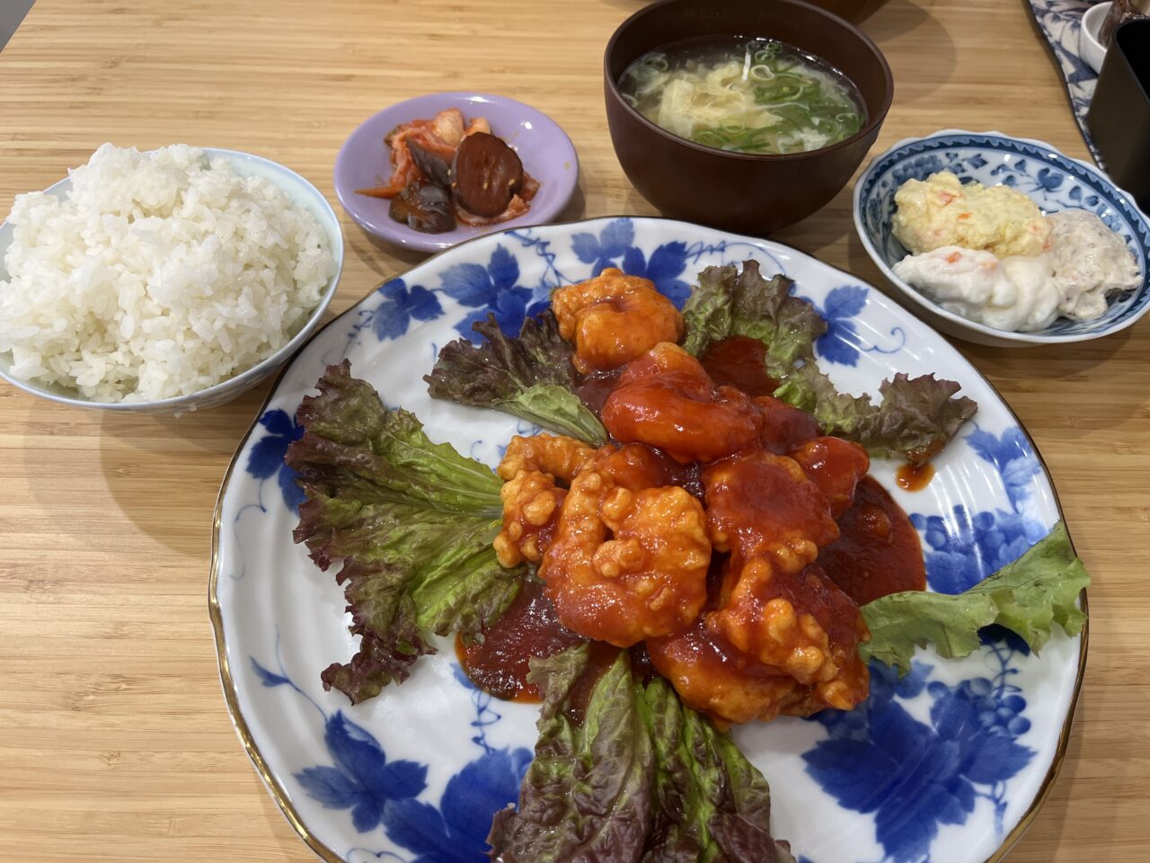 エビチリ定食です。エビチリは最初に甘みがきた後、ガツンと辛さが来ます。辛いもの好きな方にはたまらない辛さ。ごはんが進みます。ご飯は1杯目からたくさんよそってくださいますが、さらにおかわりも可。