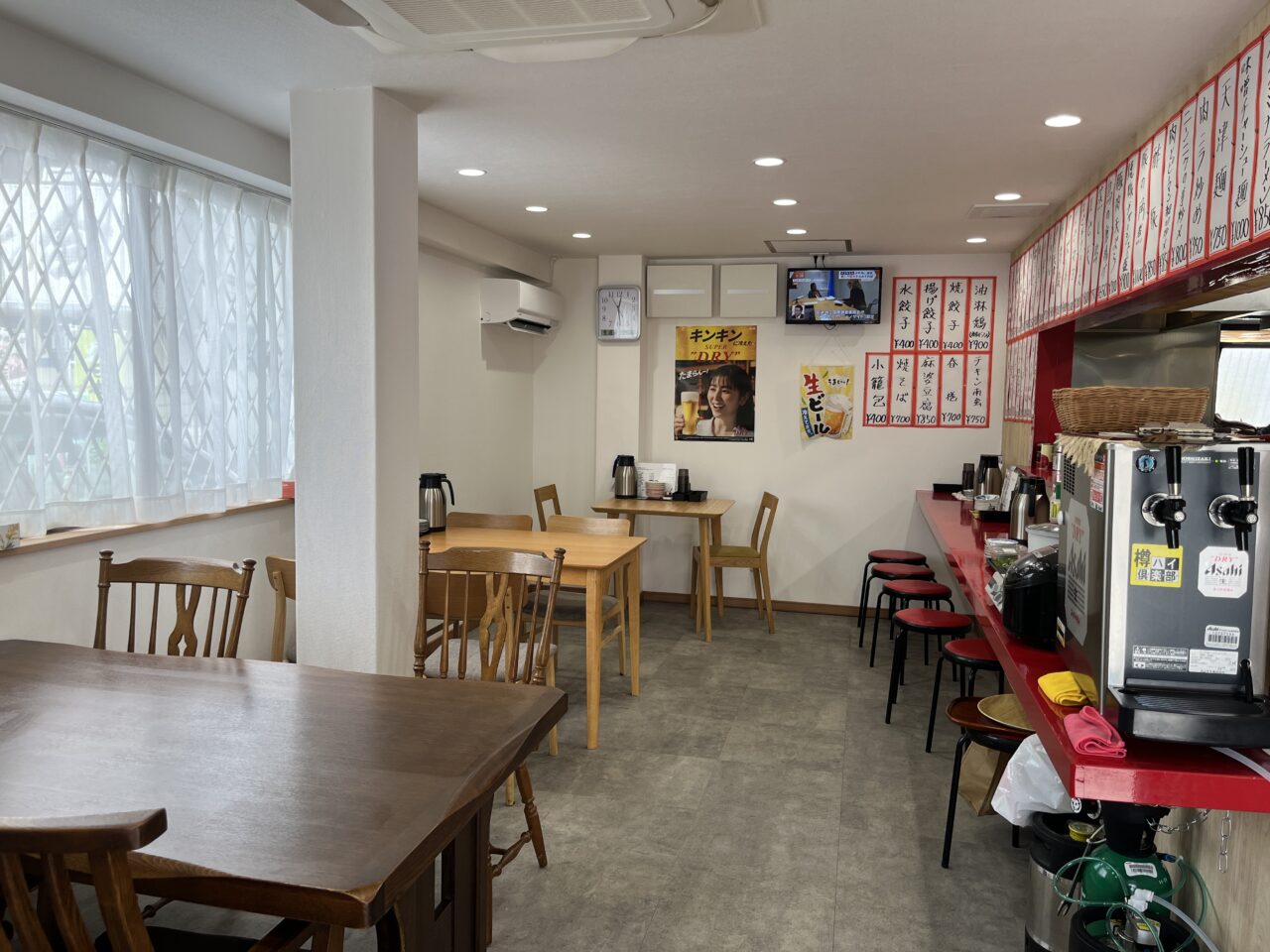 赤いカウンター、赤い縁取りのメニューがずらりと、筆者が思い描く町中華屋さんの雰囲気そのものです。テーブル席が3卓とカウンター席があります。