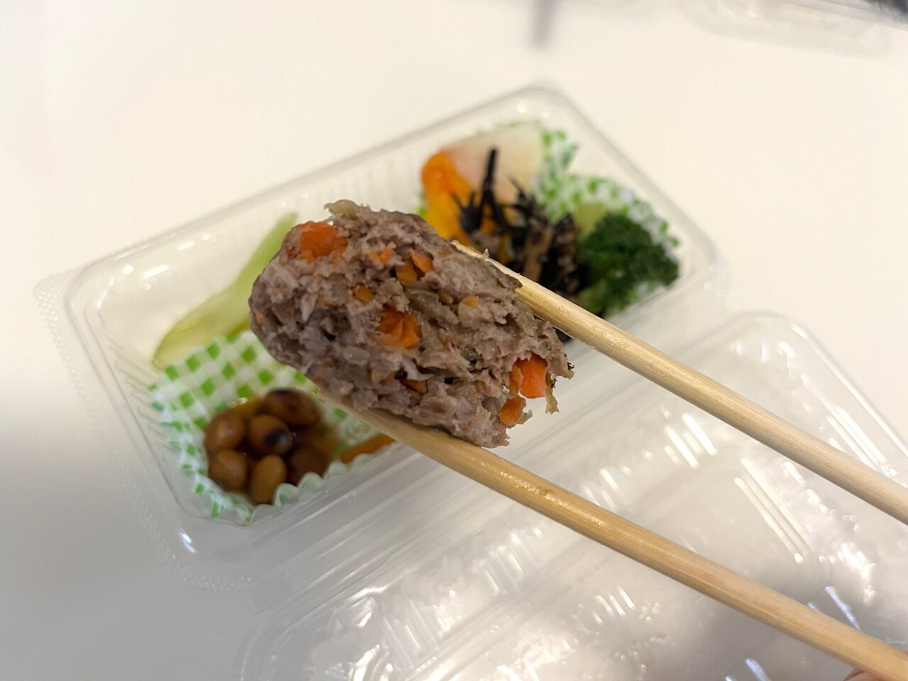 ハンバーグのきのこあんかけを購入しました。副菜が種類豊富です。電子レンジOKの容器なのもありがたい。
