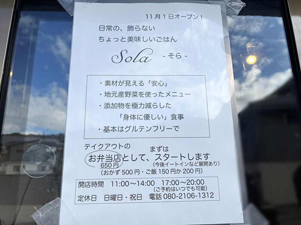 生駒駅から北に徒歩約7分ほどの場所に、お弁当屋さん「Sola(そら)」が2025年11月1日、オープンしました。