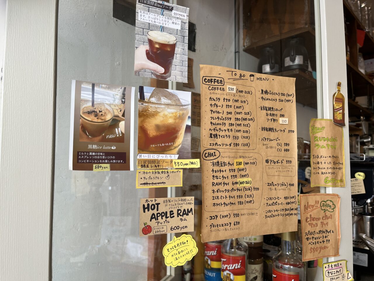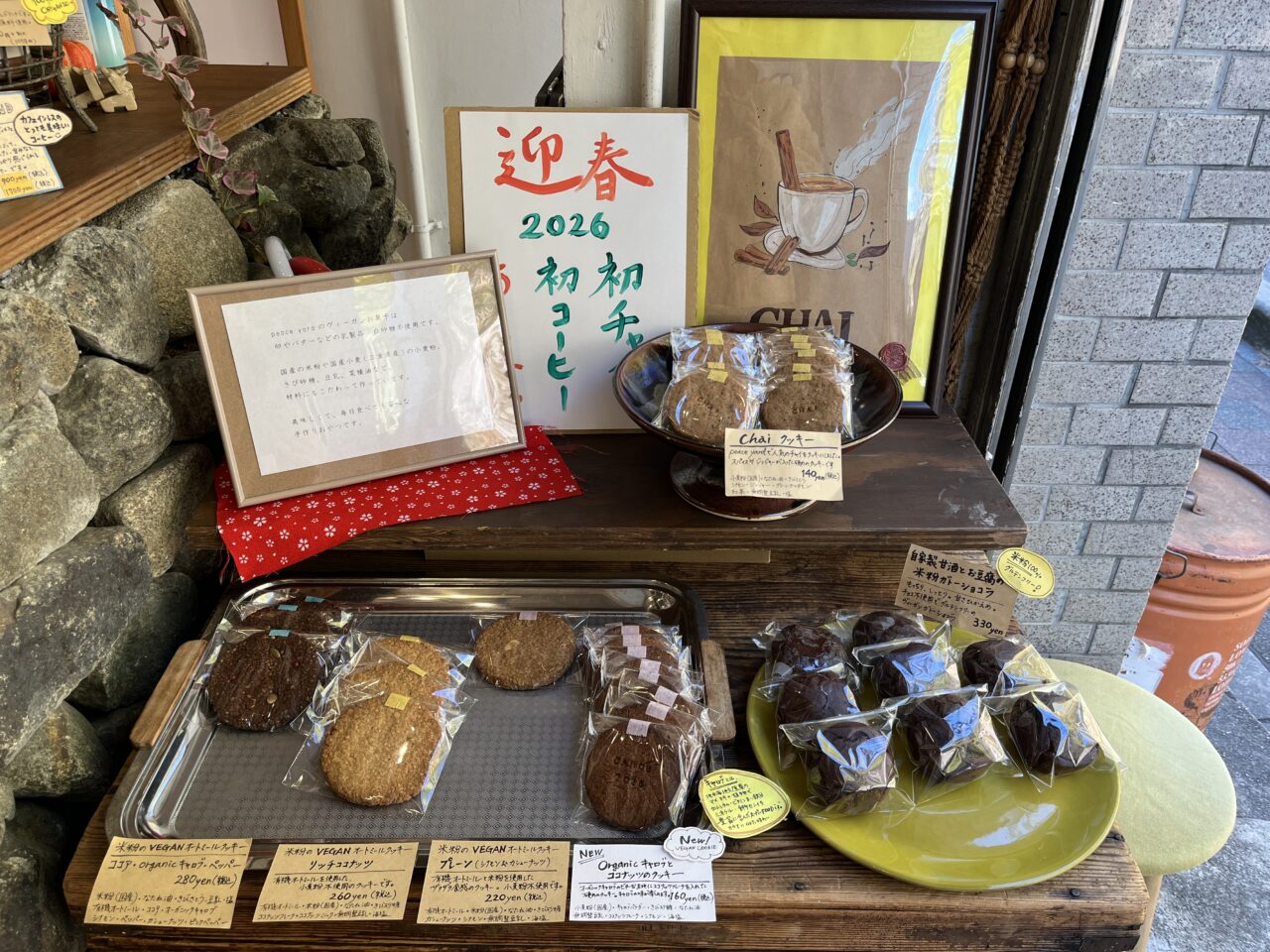 こちらのカフェでは、おいしいチャイやこだわりのコーヒー、自家製の酵素ドリンクなどのほか、手作りのヴィーガンお菓子がいただけます。テイクアウト、イートインどちらもOKです。
