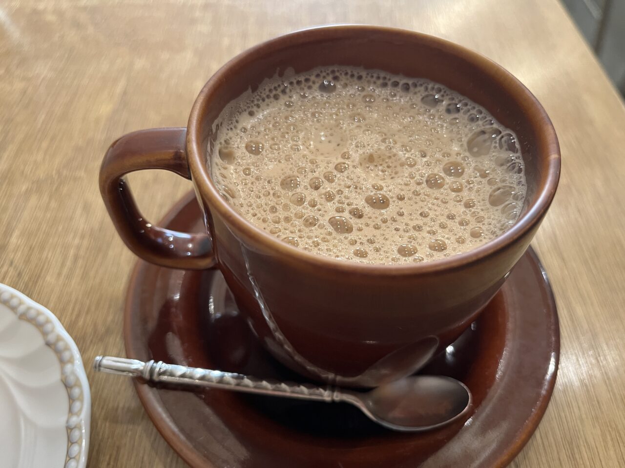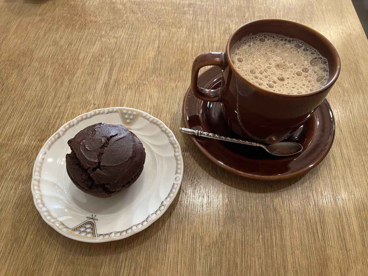 ほどよい甘さ、スパイシーなチャイが体を芯から温めてくれます。これは通いたくなる味です。米粉ガトーショコラはもっちりしっとり、やさしい甘みで食べ応えも◎