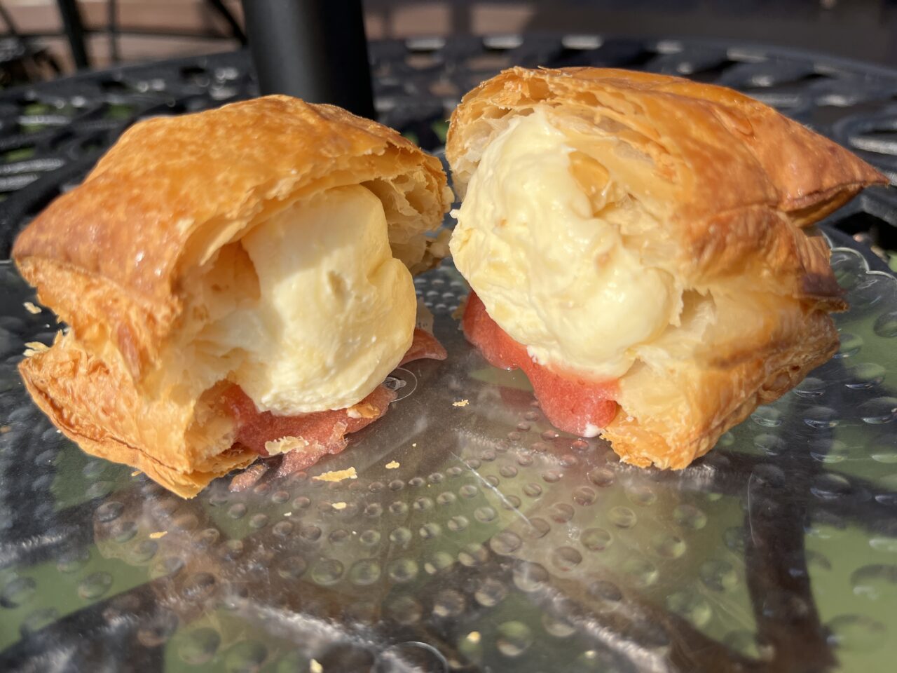 看板メニューは「古都華パイ」。サックサクのパイの中にたっぷりの自家製カスタードと生クリーム、そして甘酸っぱい古都華ソースが入った一品です。大きくて甘いもの好きにはたまらない満足サイズなのに、食べ始めるといつの間にかペロリとたいらげてしまうおいしさ。