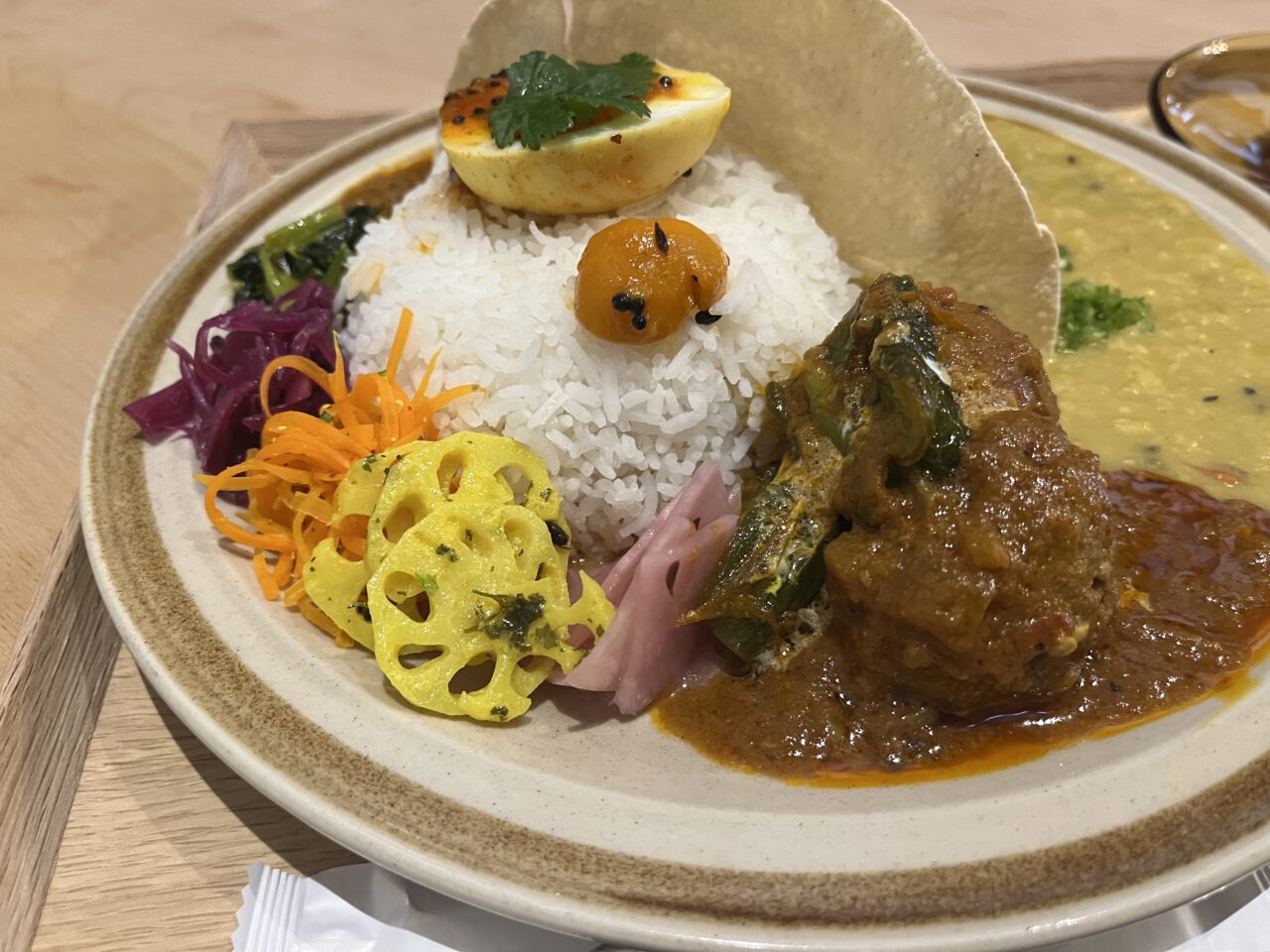 基本のチキンカレーに、週替わりのカレー(この日は肉団子のカレー)をプラスしてあいがけに。さらにトッピングの半熟卵も追加して、なんとも彩り豊かなワンプレート。